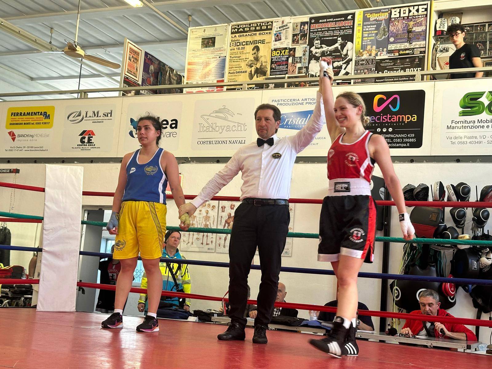 Domenica 5 maggio la squadra lucchese è invece rimasta tra le mura di casa per la manifestazione “in rosa”, organizzata per omaggiare l’arrivo del Giro d’Italia a Lucca con un richiamo alla celebre maglia destinata al vincitore della competizione. Nel corso della giornata hanno trovato però spazio anche alcuni incontri maschili fuori programma. Protagonista di uno di questi è stato Abd Almottalib Loutfi (Junior 50kg), autore di una meritata vittoria ai punti ai danni di Abed Rabbo Fares (ASD Valenzana Pietro Valdini). Spazio nel corso della manifestazione anche ad Achraf Lekhal (élite 71kg), uscito nettamente vincitore dal duro incontro con Ermir Haruni (Mugello Boxing Team). Dopodiché, degli oltre 10 incontri femminili che hanno animato la serata di pugilato, due hanno visto sul ring pugili lucchesi. Ottima vittoria per Marisa Losha (Youth 53kg) contro la comunque ostica Yelena Varese (Team Moschitta). Molto bene, infine, anche Giada Carlotti, tornata a calcare il ring con una buona vittoria contro Zinaida Ghinda (Ring Adora Boxe).