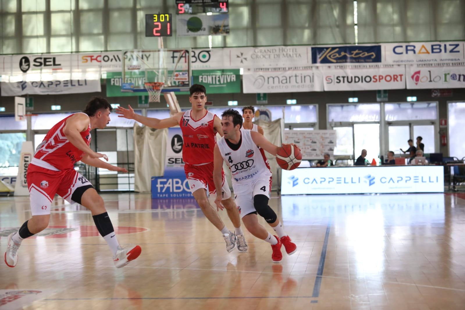 Secondo quarto, parte meglio Milano con Dall'orto, ma Capodagli in acrobazia da sotto riporta avanti Lucca (16-17). Due canestri di Vujovic per un mini allungo di Milano (20-17), ribaltato dalla bomba di Michelotti su assist di Tessaro e da quella di Rapè, ancora liberata da Tessaro (20-23).