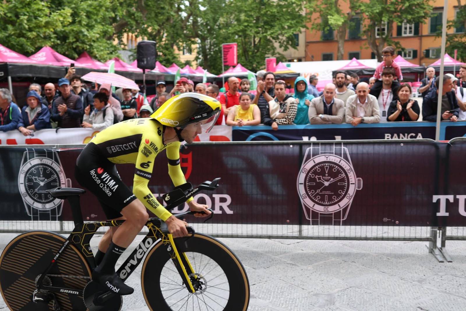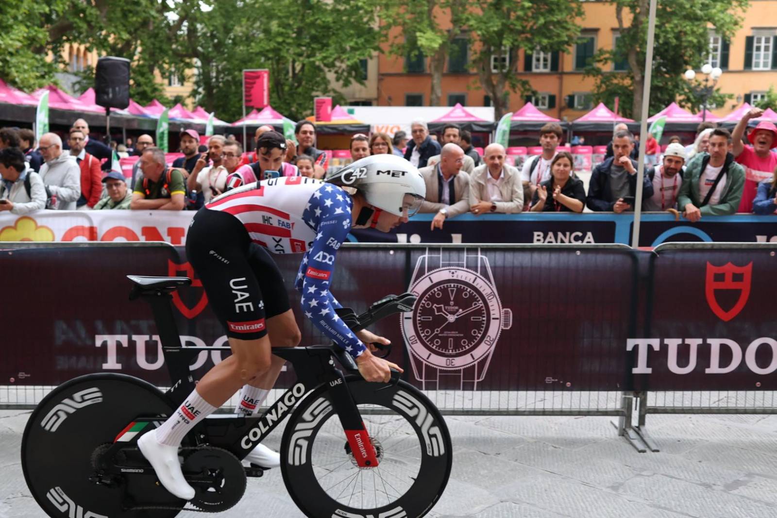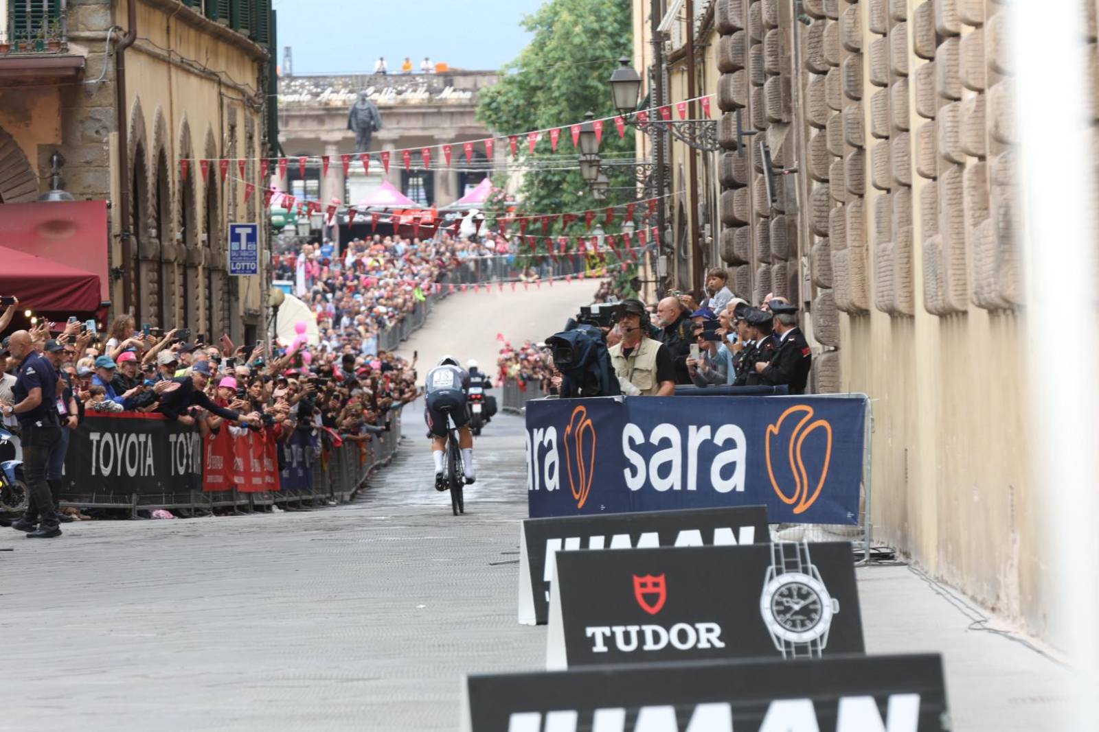 Particolarmente affollato il villaggio di partenza, con tutte le hospitality predisposte dall’organizzazione, e dove il pubblico presente ha potuto più volte assistere al passaggio dei campioni delle due ruote (171 i ciclisti al via), prima di recarsi al box di partenza e nei primi istanti di gara. Il primo concorrente ha preso il via alle ore 13.20. Il maxischermo allestito in piazza Napoleone ha poi permesso al pubblico presente di vedere, seppur sotto una leggera pioggia, tutto lo svolgimento della cronometro compreso le fasi finali della tappa che prevedeva l’arrivo a Pisa, sotto la torre pendente, in Piazza dei Miracoli. L’ordine di arrivo della 10^ tappa ha visto al primo posto l’olandese Daan Hoole, della squadra Lidl - Trek, che ha chiuso i 28,6 km in 32’:30’’ con solo 7’’ sull’inglese Joshua Tarling della Ineos Grenadiers e 10’’ su Ethan Hayter, britannico della Soudal Quick - Step.