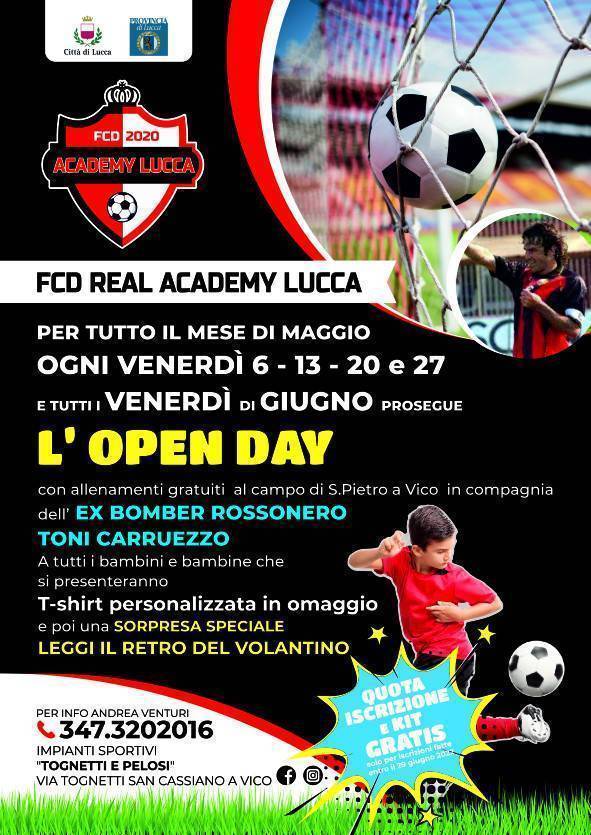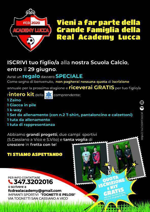 Al momento, la Real Academy Lucca conta una squadra di Allievi B, 2006, ma per il prossimo anno, potrebbe nascere una Prima squadra e soprattutto diverse formazioni della Scuola Calcio. “Abbiamo a disposizione uno staff di allenatori preparato, esperto e motivato e tanti spazi dove farli allenare – termina Venturi. La dirigenza, a partire dal nostro presidente, ha grande entusiasmo e voglia di fare bene ed ha altre sorprese in serbo per i nostri tesserati. Invito gli interessati a seguirci su facebook e instagram e a contattarmi al 347/3202016”.