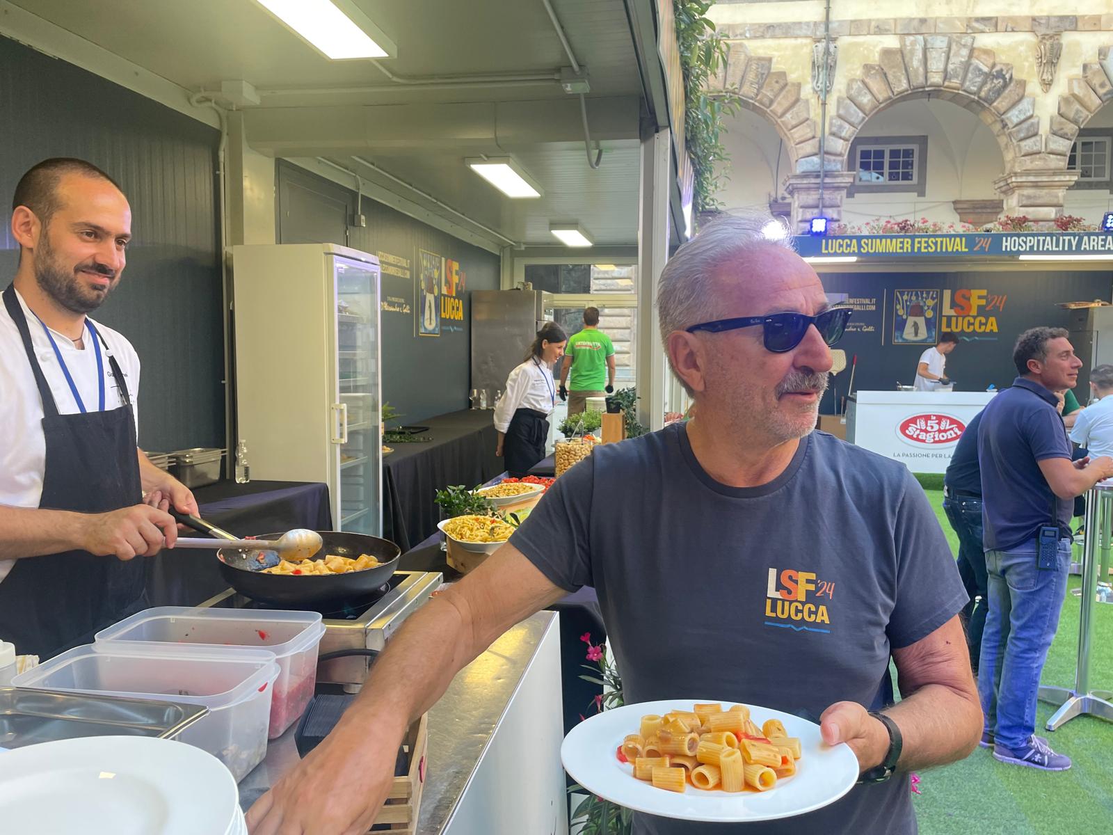 Geniale trovata pubblicitaria, comer sempre del resto, di Italo Fontana che ha fatto indossare agli addetti all'ingresso del concerto di Lenny Kravitz una maglia brandizzata U-Boat di colore arancione e, quindi, nemmeno tanto visibile. E' la sera del concerto di Lenny Kravitz esi annuncia il tutto esaurito e non soltanto davanti al palco e negli sky-box. Infatti l'area hospitality di Cortile degli Svizzeri è affollata a partire dalle 20 come non l'avevamo mai vista in precedenza anche se è vero che qualche concerto ce lo siamo saltato. Ormai sono volti familiari quelli che ogni volta gestiscono gli stand, a partire da Francesco e Galliano Vannozzi di Galliano, una sorta di istituzione vera e propria. Come si farebbe se non si potesse chiudere ogni degustazione con uno dei loro budini o con il nuovissimo gelato artigianale dedicato al Maestro Giacomo Puccini? E vogliamo parlare di Giorgio Tomei, lo chef che, puntualmente, cucina al volo una pasta che più pasta (deliziosa) non si può? Anche Mimmo D'Alessandro, oggi più calmo e rilassato del solito, ne approfitta sia pure e al contrario di noi, in maniera parca. Oltre ad assessori, rigorosamente tali, ci sono personaggi e amici come Enrico Castellacci e Francesco Bovenzi, il top del top nei loro rispettivi settori di competenza e l'ultima volta avevamo incrociato Andrea Carobbi, non solo un grande chirurgo, ma anche un grandissimo esperto di vini. A proposito di vini, quattro le aziende vinicole presenti a partire dal solito Eugenio Fontana con il suo Particolare, ma non soltanto e con i suoi nettari provenienti dalla Fattoria Buonamico di Montecarlo, una realtà ormai consolidata del manorama enologico regionale e italiano. Poi l'azienda agricola Gli Archi, situata sulle colline di Poggio alla Farnia, nel cuore del comune di Fauglia, a pochi chilometri da Pisa. Quindi Collemattoni, azienda vitivinicola che produce oltre 50 mila bottiglie Brunello compreso e si trova in quel magico luogo che risponde al nome di Montalcino. Infine Lucca Biodinamica, una iniziativa singolare e apprezzabile. A Lucca, infatti, un nutrito gruppo di agricoltori ispirati da Alex Podolinsky si sono riuniti per condividere esperienze e fare rete per contribuire con responsabilità alla crescita di questo territorio incantevole, percepire attivamente la natura e interagire con essa. Ecco le aziende partecipanti e i cui vini si possono degustare allo stand del Lsf: