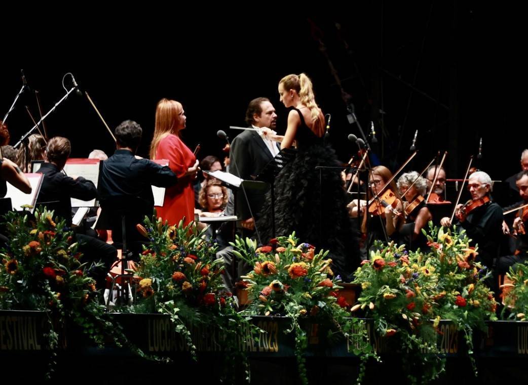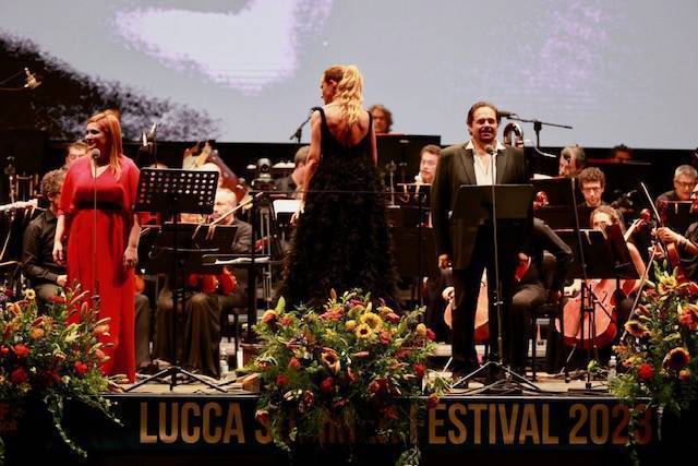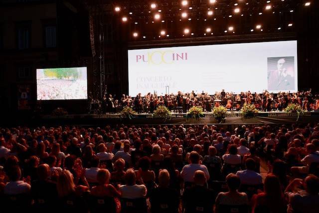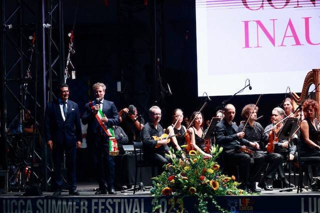 Una piazza Napoleone gremita e un palco d'eccezione - gentilmente concesso da Mimmo D'Alessandro - con l'orchestra comunale del Teatro Carlo Felice di Genova, per la serata inaugurale delle celebrazioni per i 100 anni dalla morte di Giacomo Puccini. A fare gli onori di casa il sindaco di Lucca, Mario Pardini, accanto al presidente del comitato per le celebrazioni pucciniane, Alberto Veronesi, che insieme hanno salutato e ringraziato tutti i protagonisti di questa eccezionale serata: i sindaci di Pescaglia e Viareggio, rispettivamente Stefano Bonfanti e Giorgio Del Ghingaro, l'orchestra, e i cantanti, la soprano Carmen Giannattasio, il tenore comasco Marco Berti e il baritono lucchese Massimo Cavalletti, trio eccezionale di voci incantevoli che hanno strappato applausi scroscianti, e poi il Numero 1 del Teatro del Giglio, il presidente Giorgio Lazzarini e infine il direttore d'orchestra Beatrice Venezi, lucchese come Massimo Cavalletti, e che portano nel mondo, insieme alla loro bravura, la musica dell'altrettanto nostro grande maestro Giacomo Puccini.