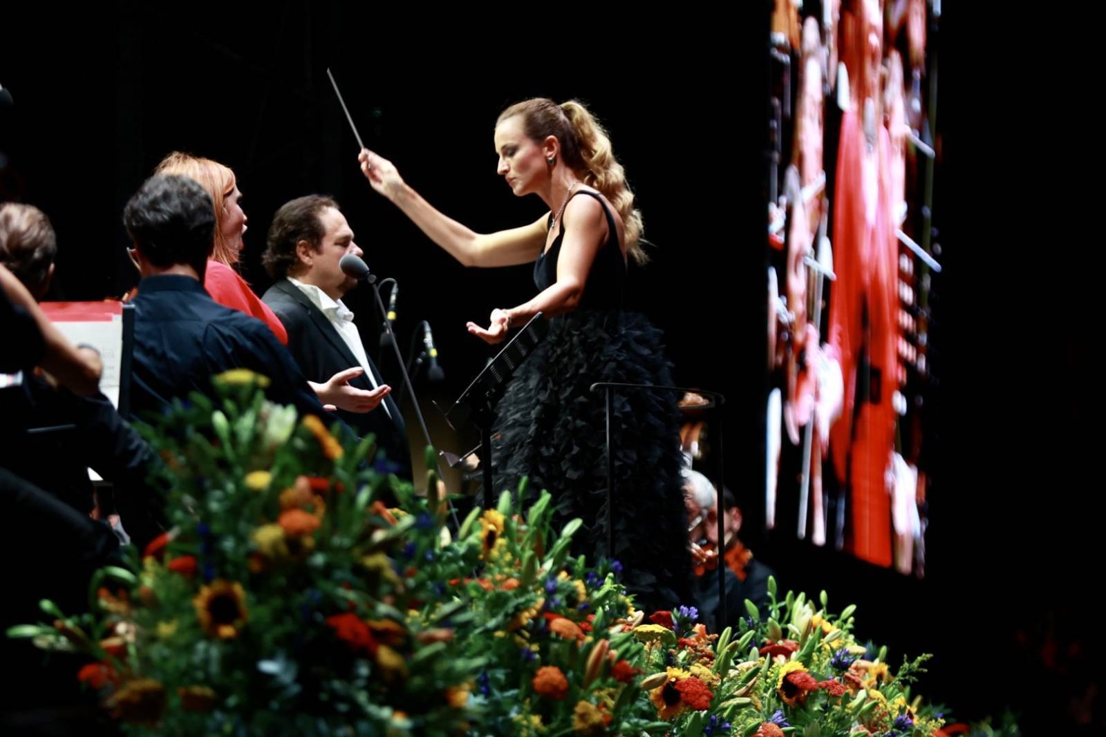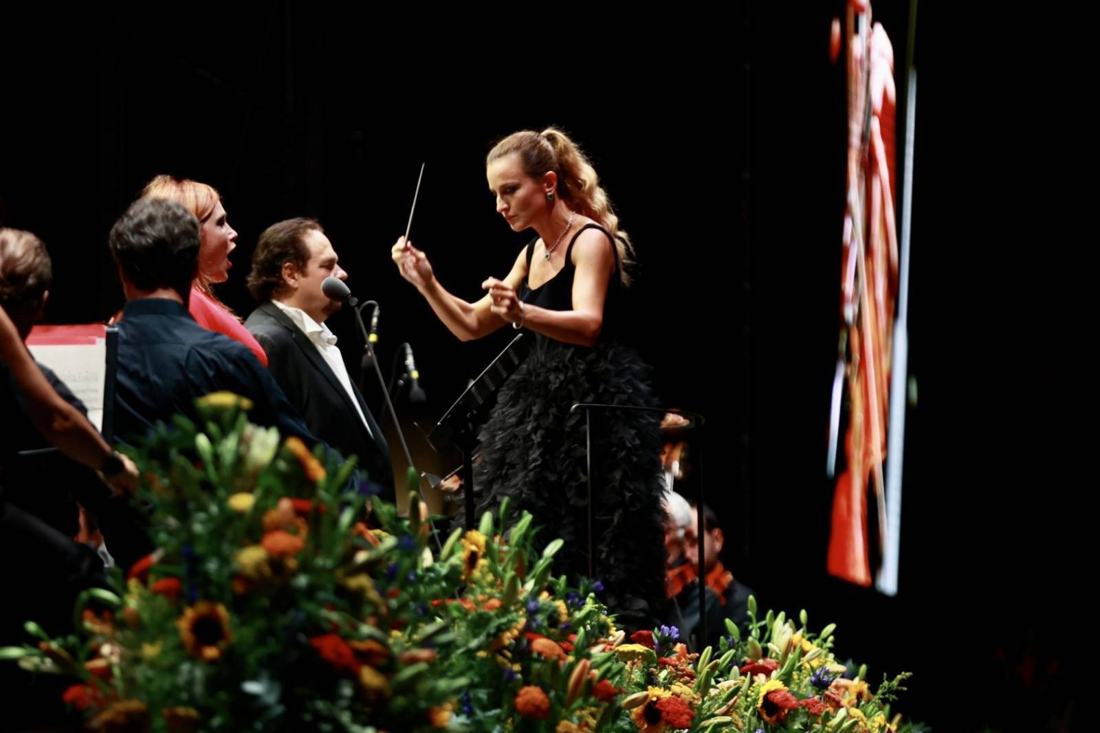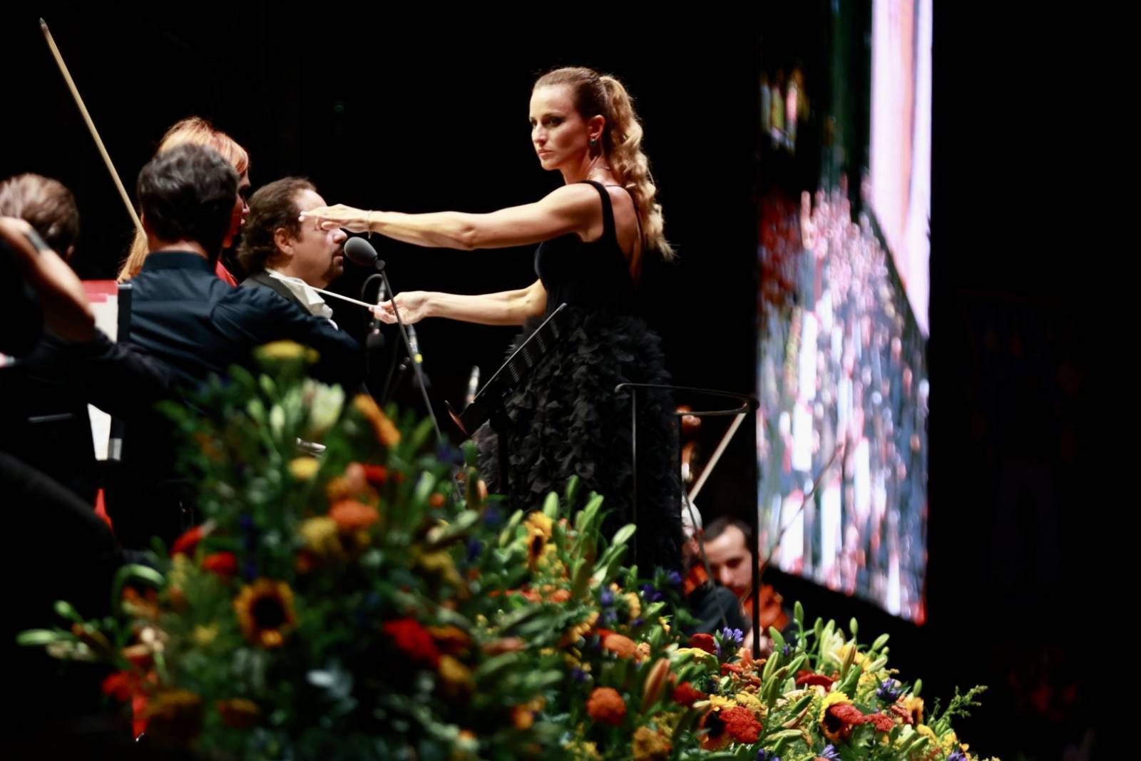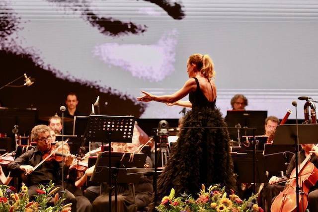 Beatrice Venezi è salita sul palco in un vestito con un corpetto di raso nero ed una gonna interamente rivestita di petali di tulle nerissimo e, radiosa come sempre, ha dato il via ad un emozionante Inno di Mameli mentre un enorme bandiera verde bianca e rossa ha campeggiato dall'enorme monitor del palco mentre tutto il pubblico si alzava in piedi.