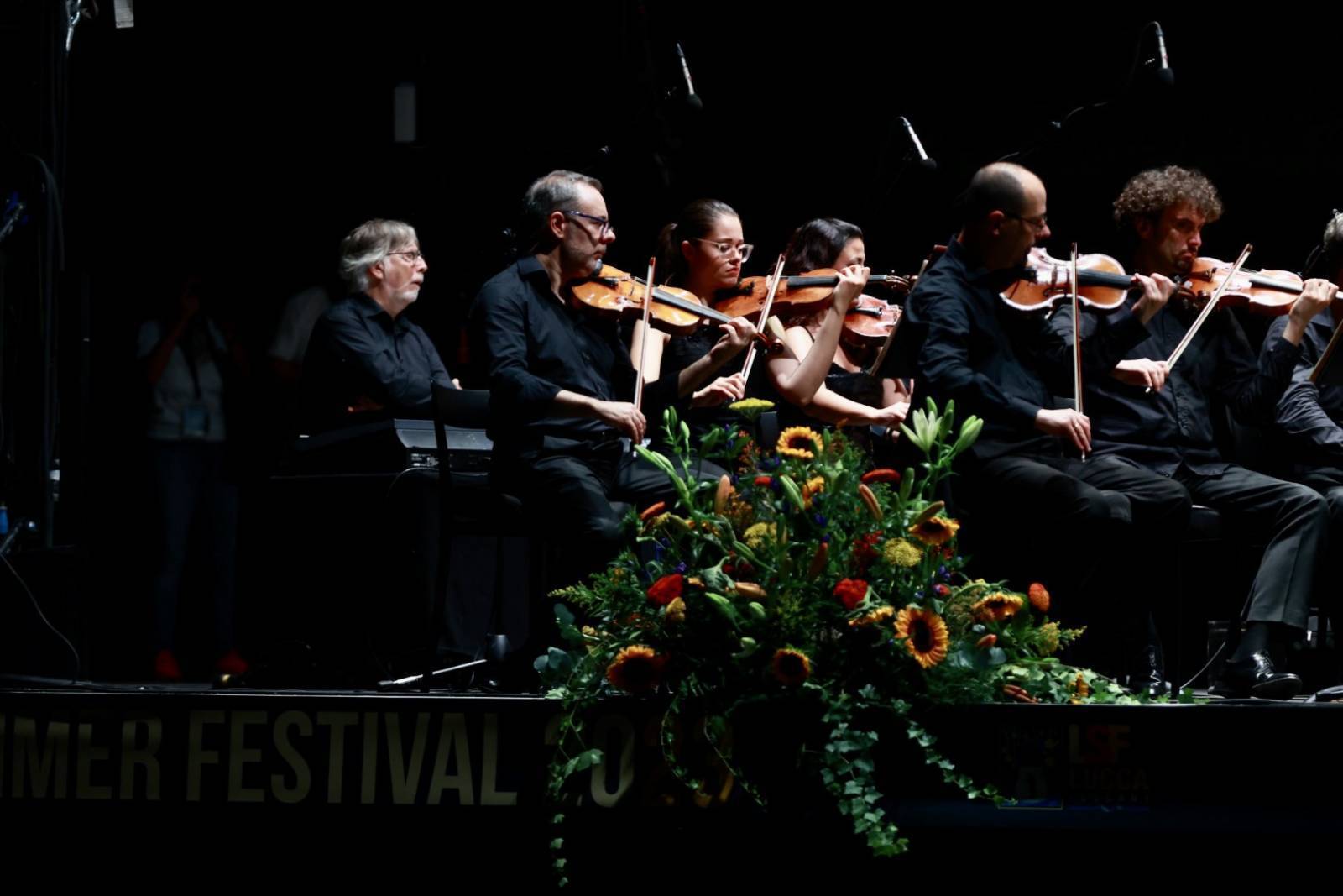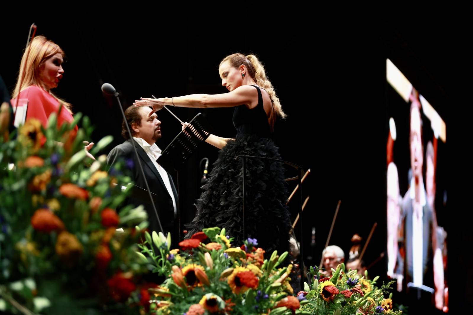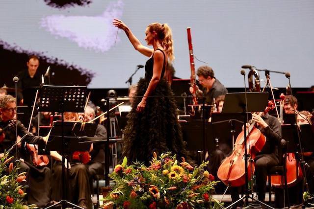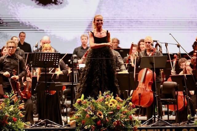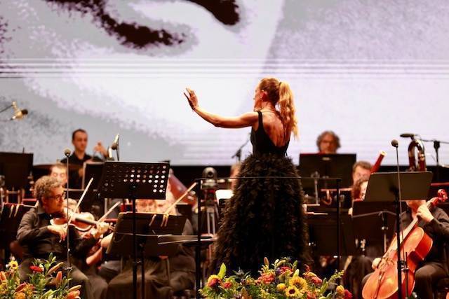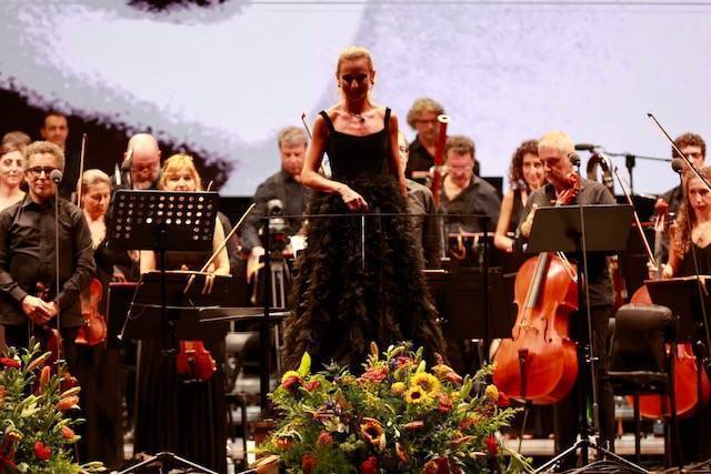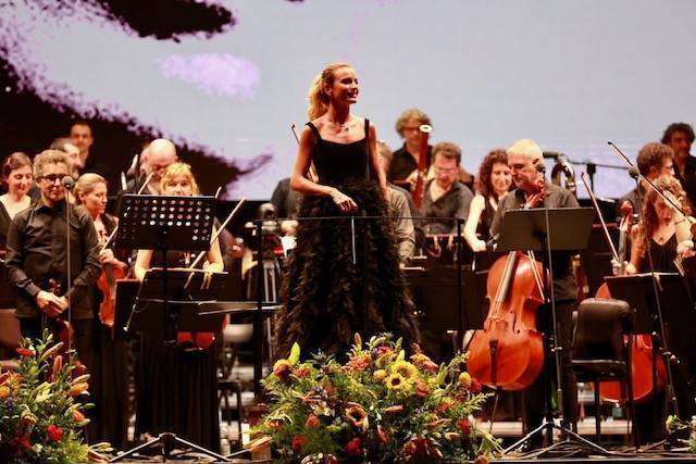 Beatrice Venezi è salita sul palco in un vestito con un corpetto di raso nero ed una gonna interamente rivestita di petali di tulle nerissimo e, radiosa come sempre, ha dato il via ad un emozionante Inno di Mameli mentre un enorme bandiera verde bianca e rossa ha campeggiato dall'enorme monitor del palco mentre tutto il pubblico si alzava in piedi.