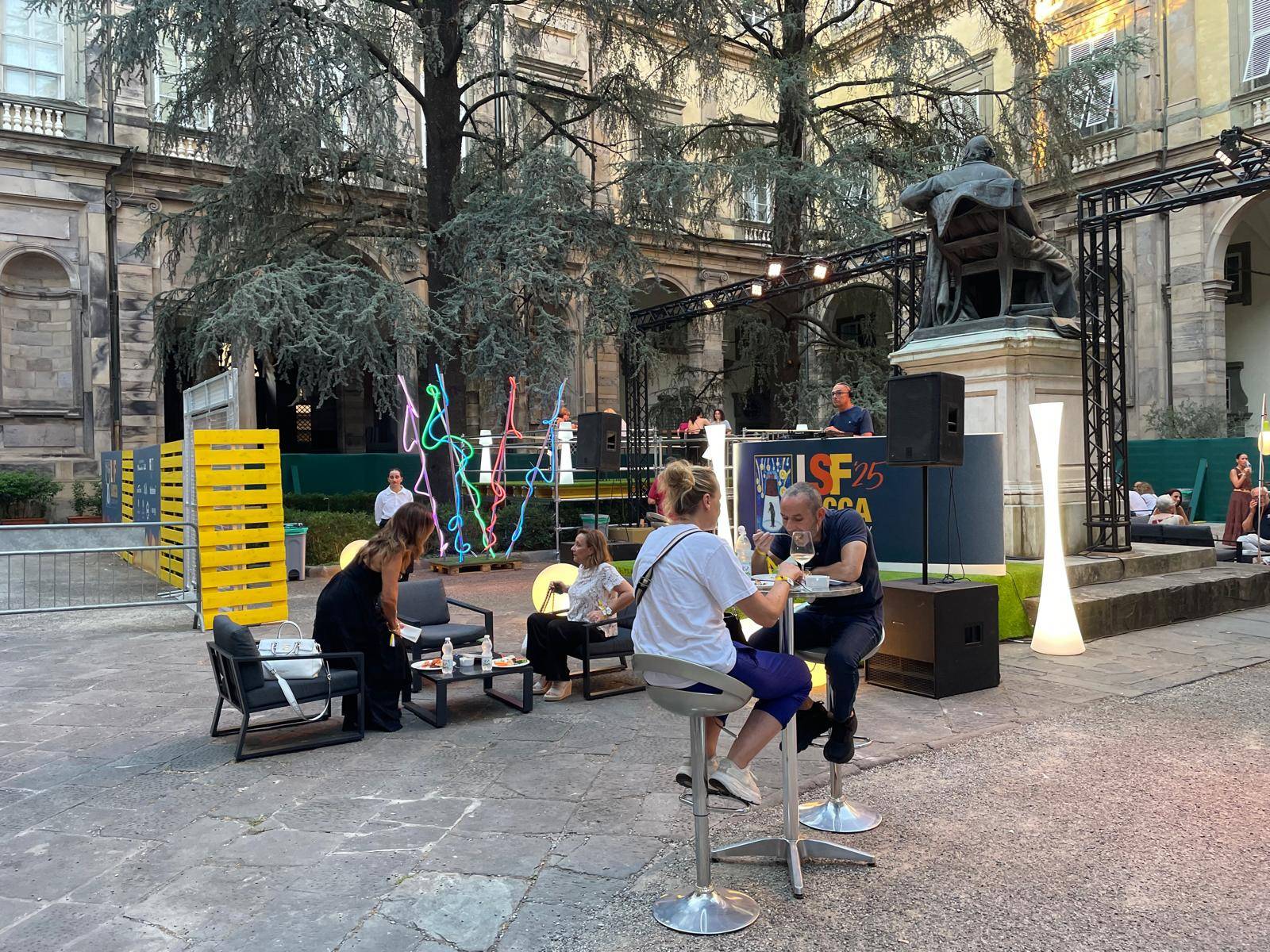Qualcosa, anzi, parecchio è cambiato, ma la sostanza, quella, è rimasta com'era e come è sempre stata. L'area hospitality del Lucca Summer Festival si è trasferita dal Cortile degli Svizzeri ad un altro Cortile, quello di Palazzo Ducale, e se anche, logisticamente qualcosa è mutato, basta qualche giorno per abituarsi alla nuova disposizione che, indubbiamente, pecca di luminosità essendo maggiormente circondata dagli edifici, ma aumenta l'intimità e la possibilità di usufruire di alcuni tavoli posti su delle 'torri' appositamente realizzate.