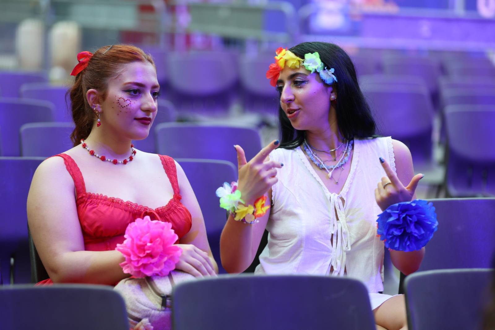 Uno spettacolo fatto non solo di musica, ma anche di una coreografia dove si sono susseguiti i cambi d’abito di Mika: vestito multicolor in stile anni ’80, vestito bianco, e tuta con brillantini argentati e per il finale vestito rosa fluo. Accanto video con cartoni animati e oggetti comparsi sul palco come la bandiera arcobaleno simbolo della pace e dei diritti Lgbtqi+ che si è trasformata in un arcobaleno gonfiabile enorme, o i cuori dei video che si sono trasformati in un enorme cuore rosso gonfiabile con una M bianca.