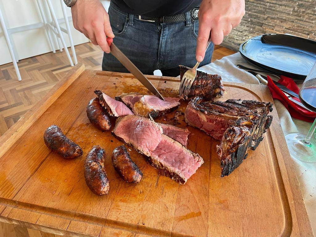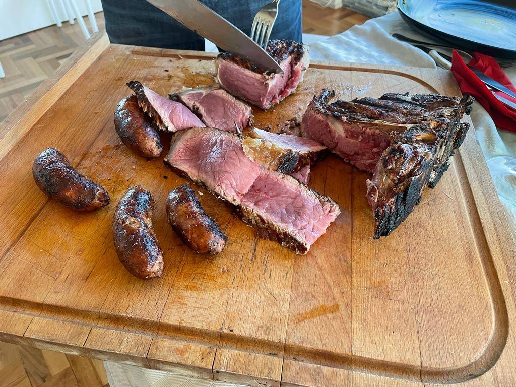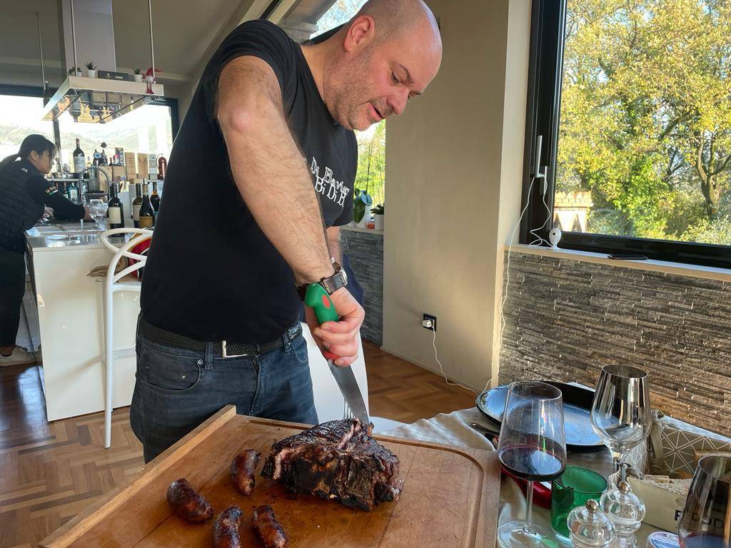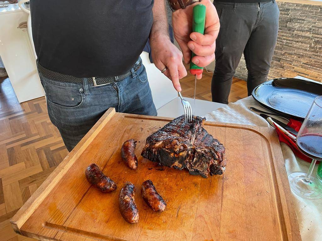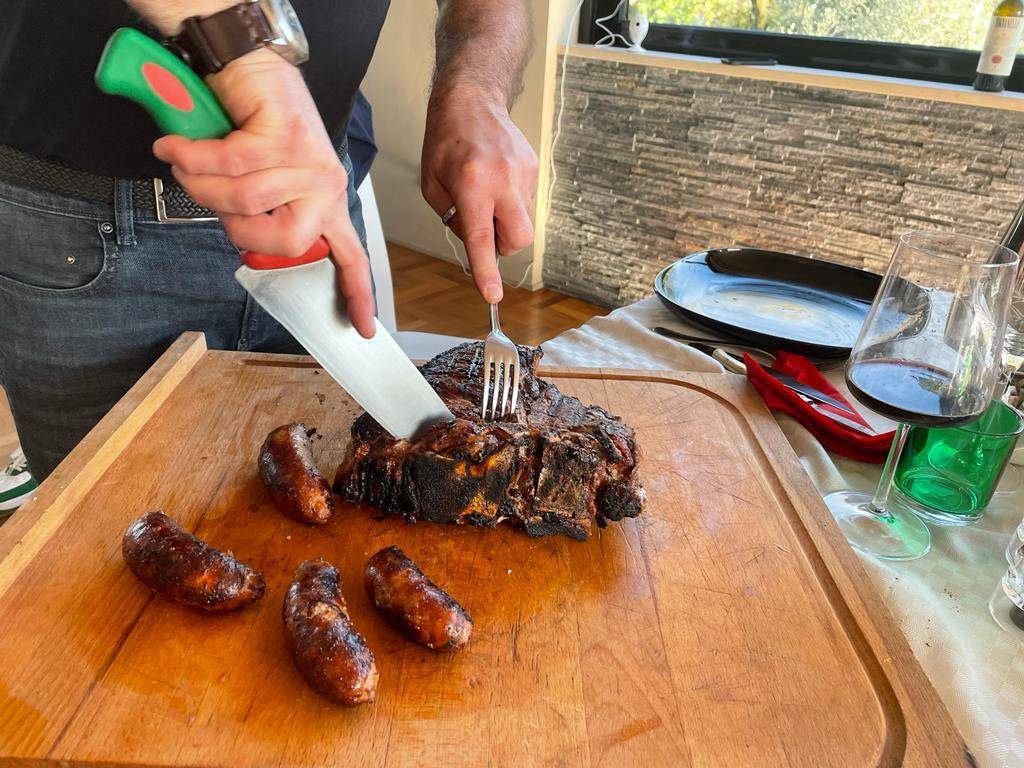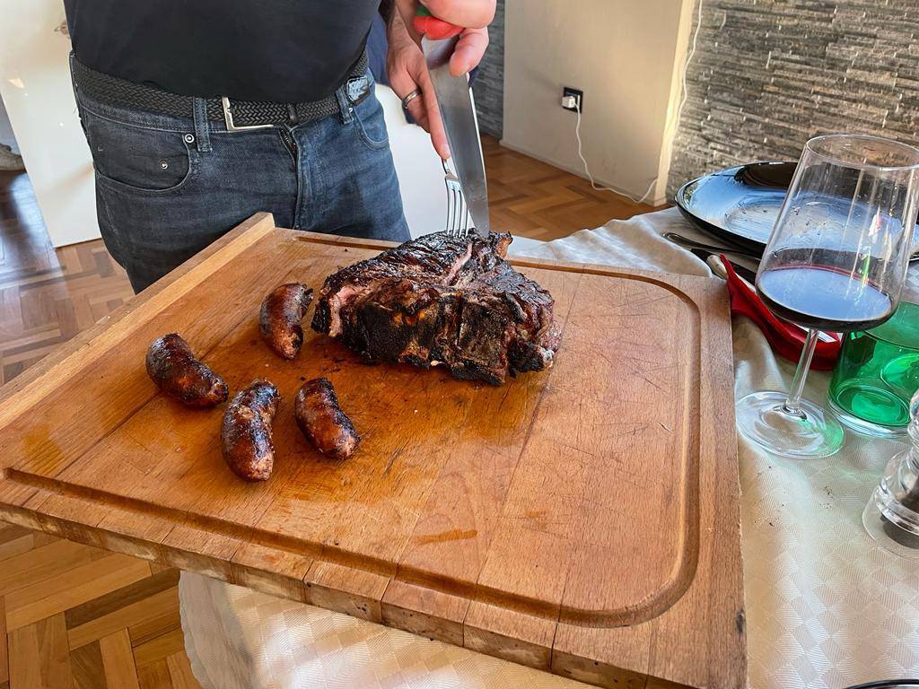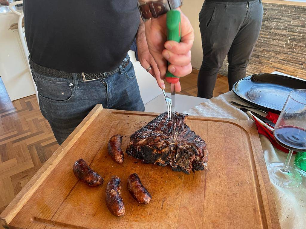 E' mister Vichi che taglia la bistecca, del resto e probabilmente, anche l'unico che sa come si fa. La carne è tenera ancora più del burro, impossibile non riuscire a masticarla e a farsela andare giù per quel tubo digerente che dovrebbe chiamarsi esofago e raggiungere lo stomaco. Per non parlare delle salsicce, favolose. Siamo stati anche, durante un breve periodo della nostra gioventù incosciente, vegetariani, ma in età adulta abbiamo cominciato a comprendere quello che ci eravamo persi e ci stavamo perdendo. Carne rossa fa male, ma un paio di volte alla settimana si può fare. Non di più, ma perdonateci la franchezza: come va giù il vino rosso buono con la bistecca è qualcosa di indefinibile.