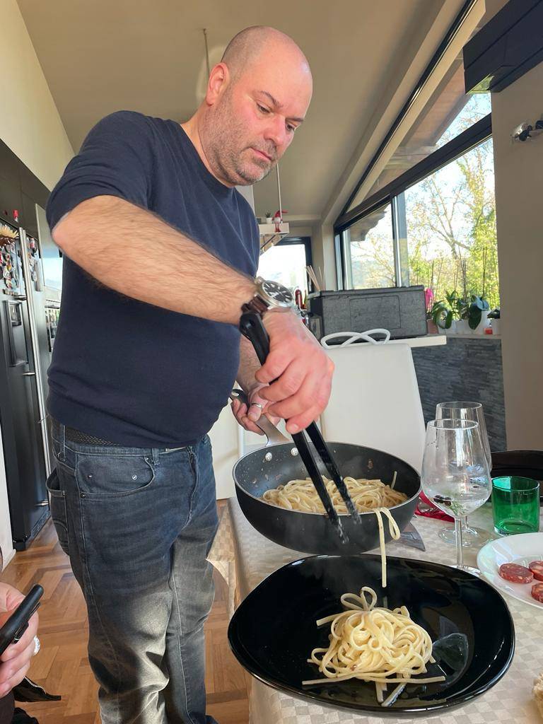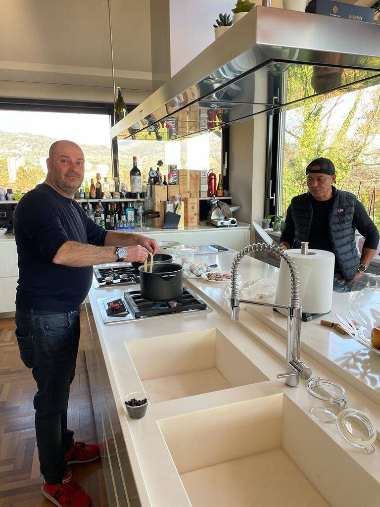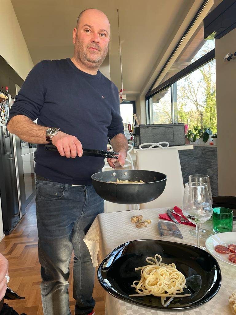 Le presentazioni sono informali, bene o male, più bene che male, ci si conosce tutti. Maurizio Vichi si è portato dietro una bistecca alta cinque dita, direttamente dalla macelleria Media Valle Carni e anche qualche salsiccia. Dice che sono strepitose, vedremo. Intanto è al fornello della cucina a vista sistemata in una isola in mezzo ad una enorme sala con vetrage sulla campagna lucchese. Nell'acqua bollente cuociono le linguine destinate ad essere cosparse di tartufo d'Alba bianco che Vichi maneggia con cura nemmeno si trattasse di pepite d'oro.