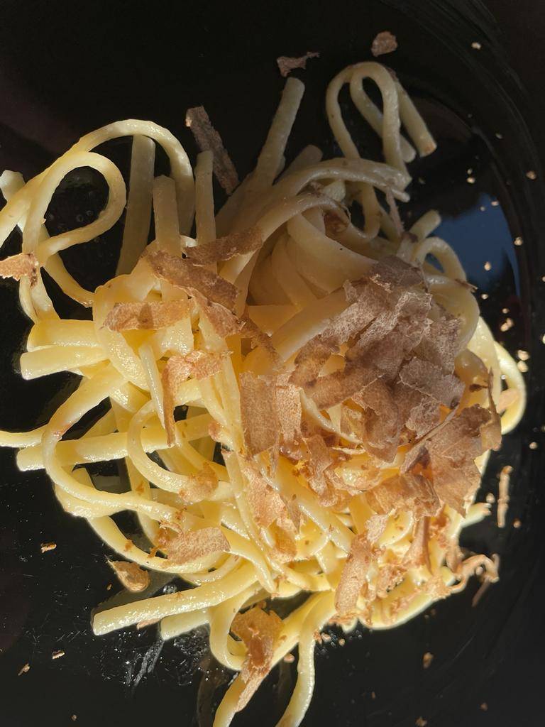 Tutti a ceccia, finalmente e dopo un aperitivo che rifiutiamo con gentilezza e parsimonia, ecco sbarcare sulla tavola apparecchiata con gusto e semplicità la pasta su cui viene grattugiato il tartufo senza badare alla quantità. Azz... che roba.