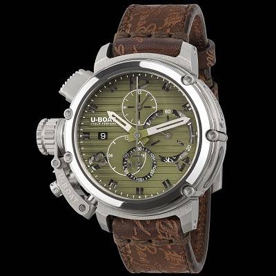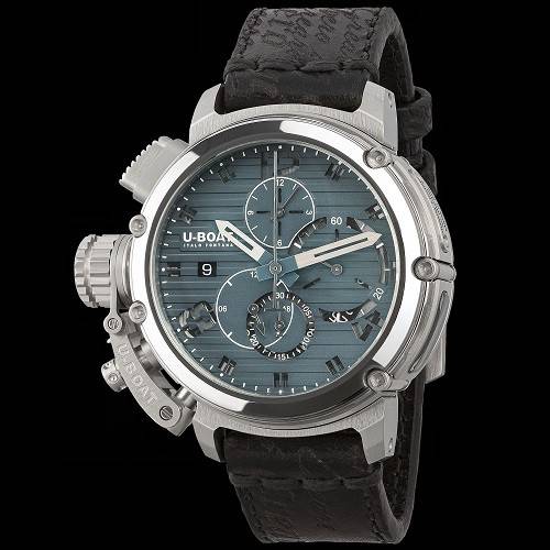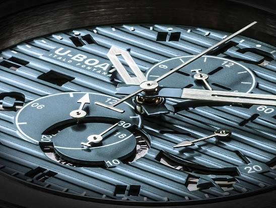 Il retro cassa è serrato da cinque viti esterne, con una chiave personalizzata, per garantire una resistenza all'acqua fino a 100 metri e un'apertura nel retro e laterale entrambe in vetro minerale fumé permettono di ammirare il movimento automatico Sellita SW500, meticolosamente personalizzato da U-BOAT con rotore, in ottone e tungsteno, e i ponti decorati a perlage e rodiati che rappresentano un'ode all'artigianalità orologiera.
