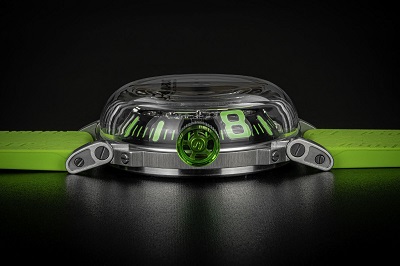 L’attenzione al dettaglio trova la sua massima espressione nella corona con inserto in vetro, che richiama la tonalità della Super-LumiNova impiegata sia per gli indici che per le sfere del quadrante per un’estetica coerente e luminosa, viva anche nel buio. Tre diverse nuance — verde, bianco e turchese— diventano il filo conduttore dell’orologio, riprese anche nel rotore di carica a vista sul fondello e nei cinturini in silicone coordinati per le versioni cassa acciaio e neri per quelle in PVD.