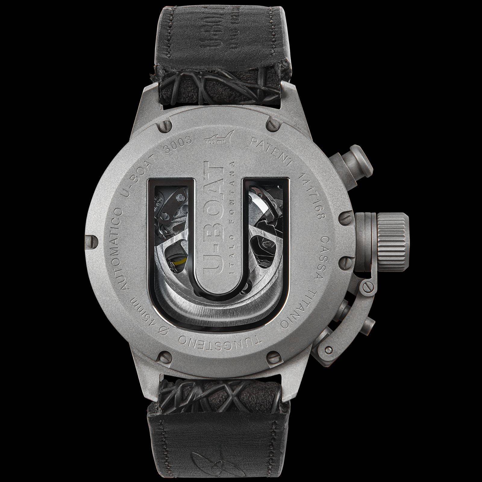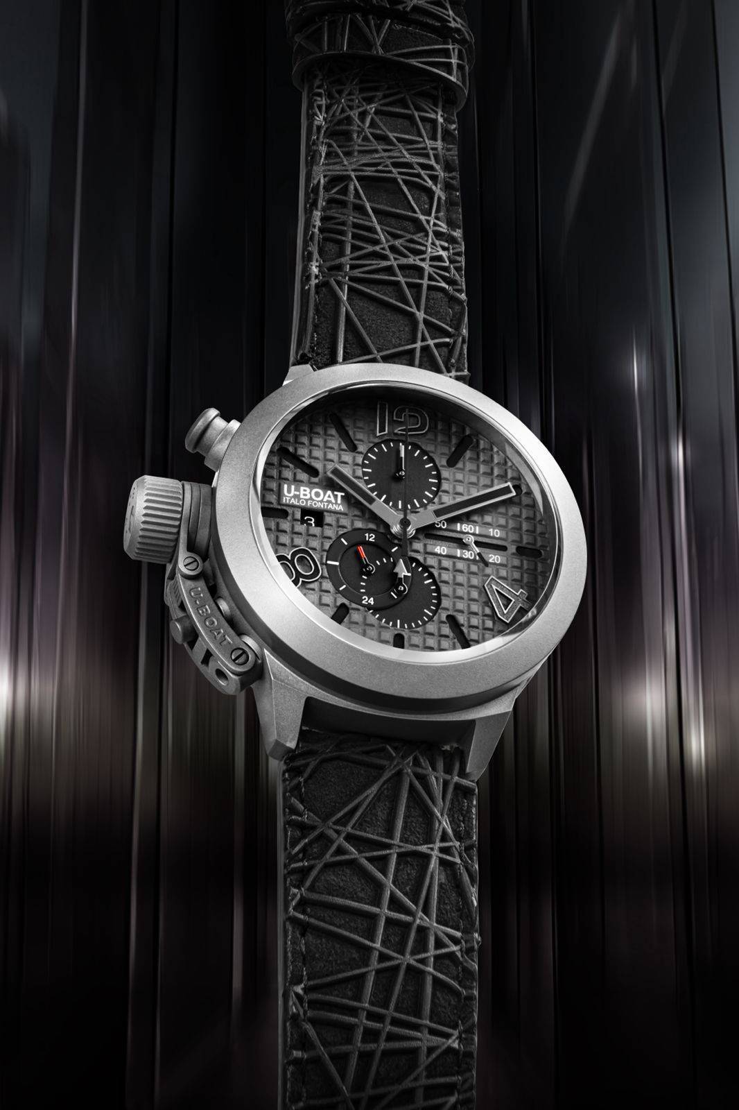 Edizioni limitate e numerate di soli 299 esemplari per colore, sul lato sinistro della cassa, come da trademark di tutti gli orologi U-BOAT, la corona con il caratteristico copri-corona di grande dimensione, assicurato alla cassa attraverso un gancio di protezione, è affiancato da un discreto pulsante brevettato per la facile estrazione della corona (a ore 8.30) e incorniciato da quello di attivazione cronografo e quello di reset, posizionati rispettivamente alle ore 8 e 10.